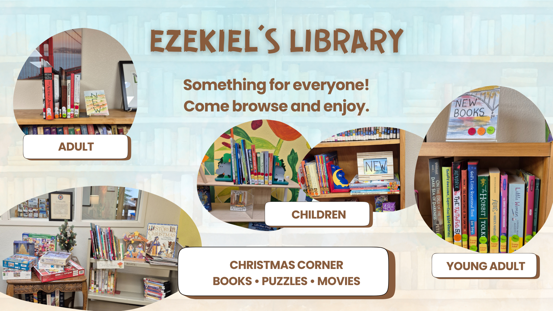 The image shows the exterior of Ezekiel Lutheran Church, a brick building with a sign and landscaped yard, surrounded by trees and a sidewalk.
